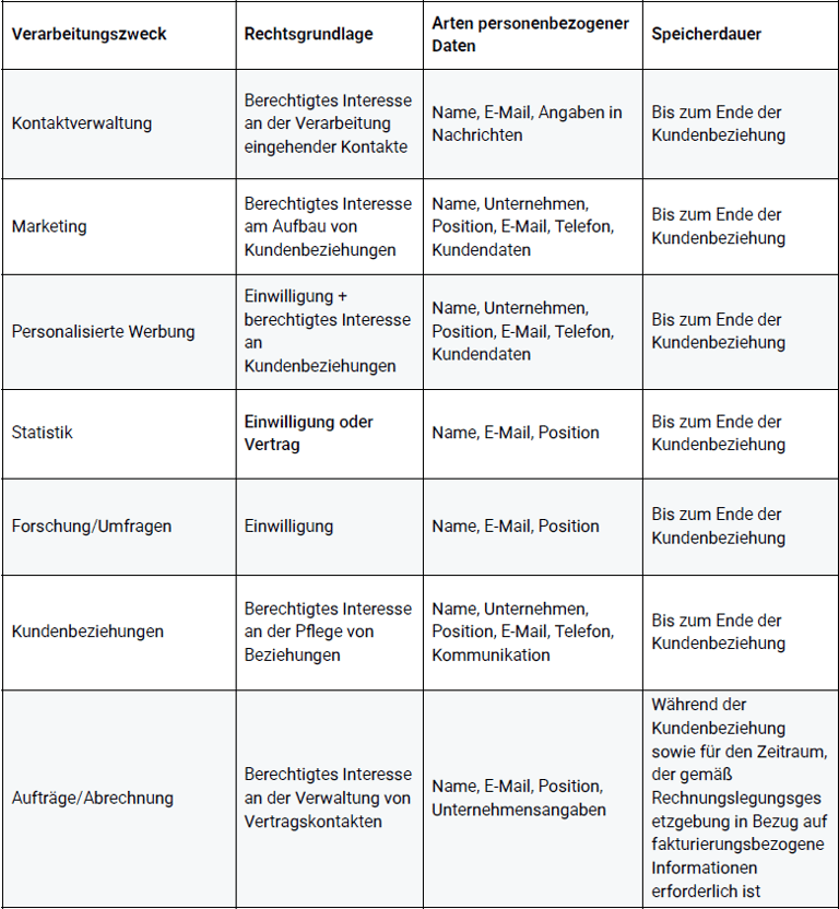 Personenbezogene Daten können für folgende Zwecke verarbeitet werden: